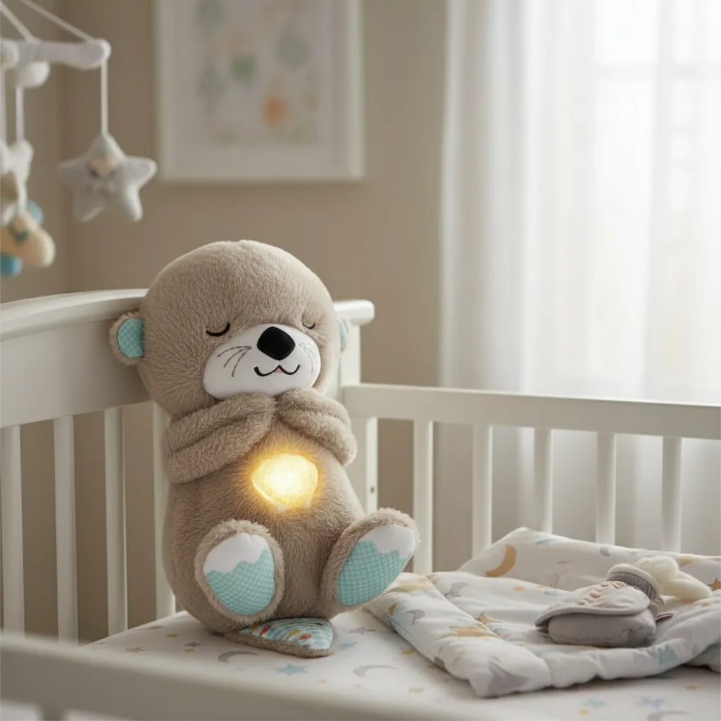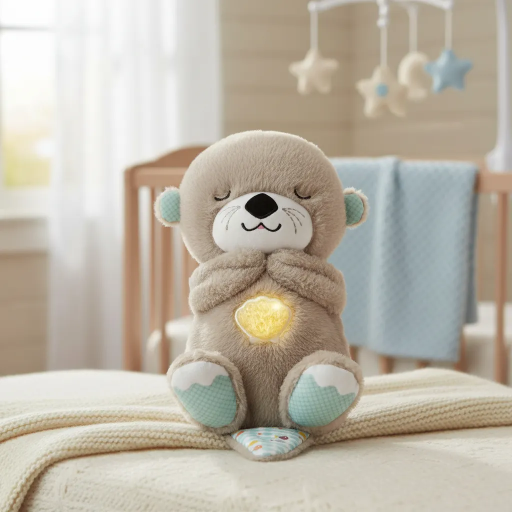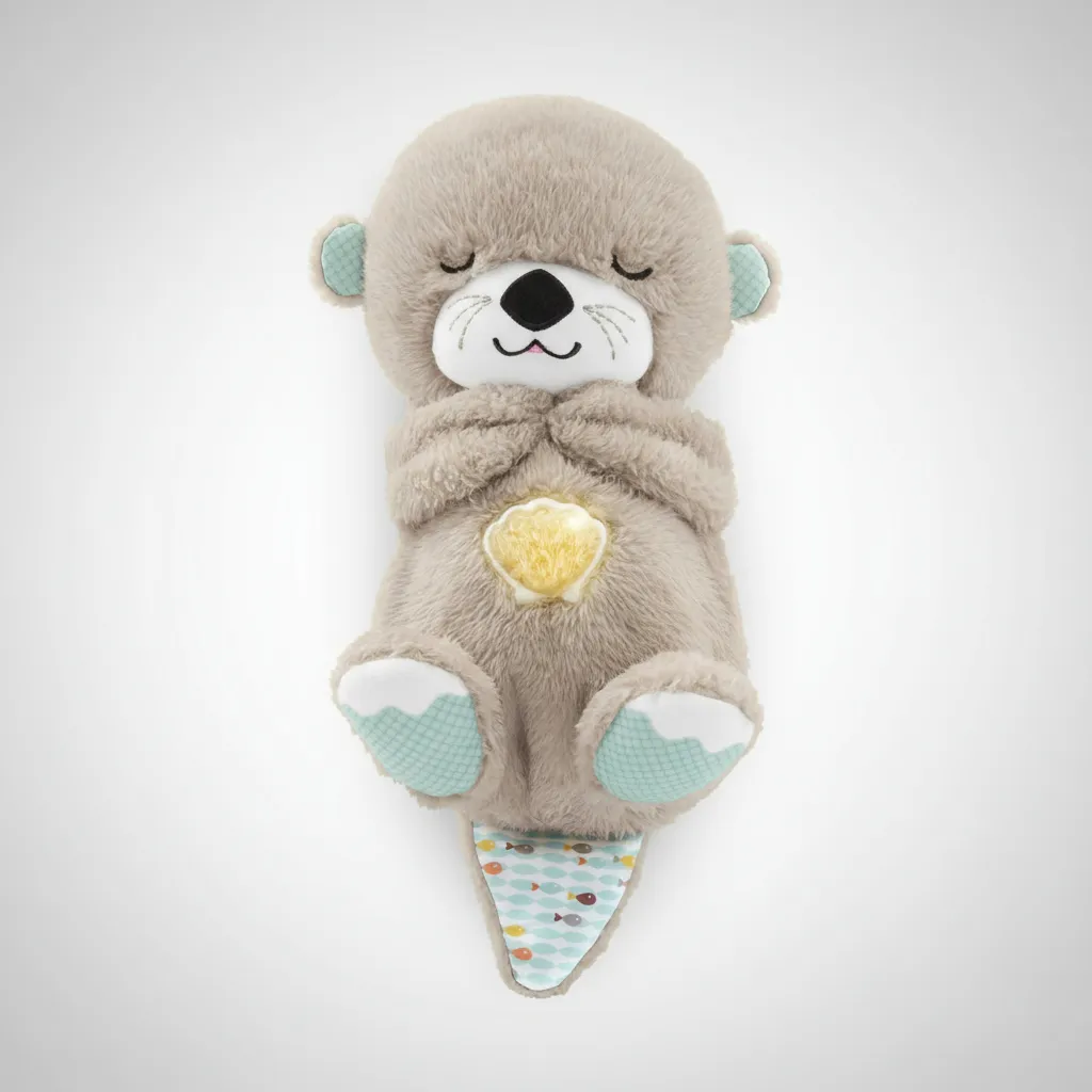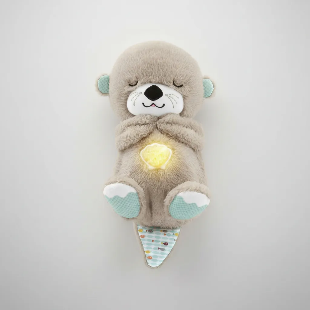 Nutria de peluche con dispositivo a pilas que cuenta con 30 minutos de música relajante en mas de 10 melodías diferentes. Veladora, movimientos en la pancita que simulan respiración, ronquiditos y ruido blanco.